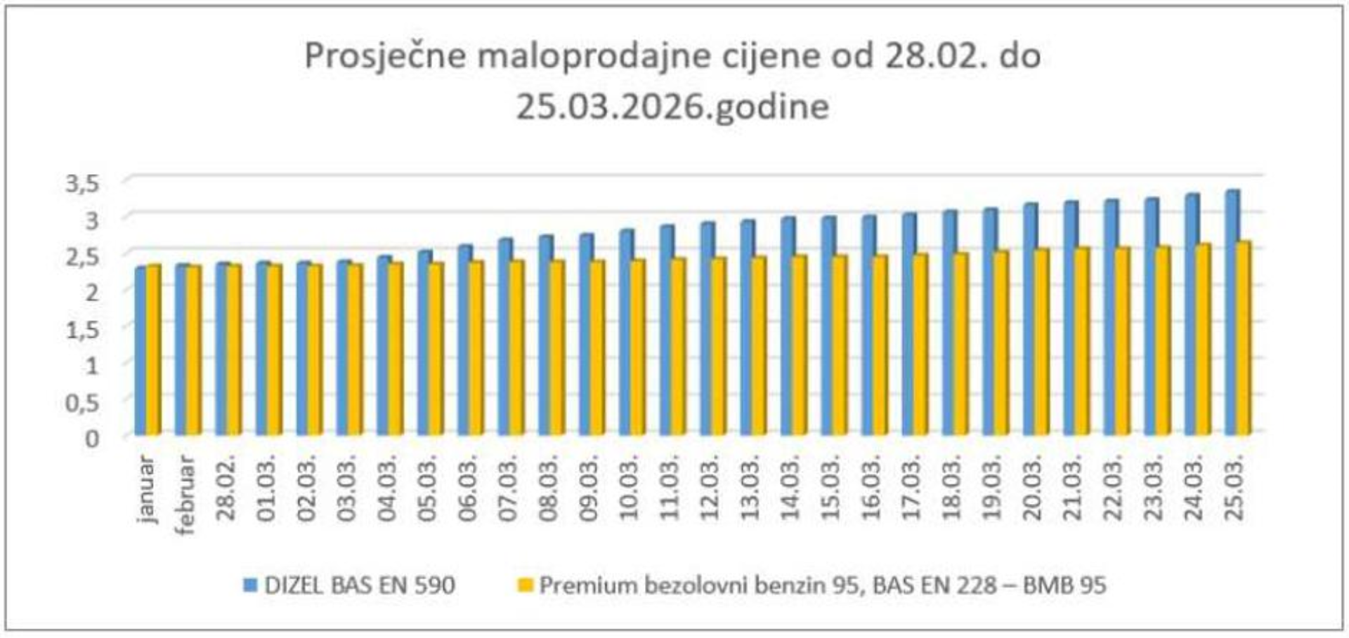 Maloprodajne cijene naftnih derivata na crpkama u Federaciji BiH porasle su i danas. Prosječna cijena litre premium bezolovnog benzina 95 iznosi 2,64 KM, što je za tri feninga više nego jučer, dok je prosječna cijena litre dizela 3,34 KM, što je za 5 feninga više u odnosu na dan ranije.